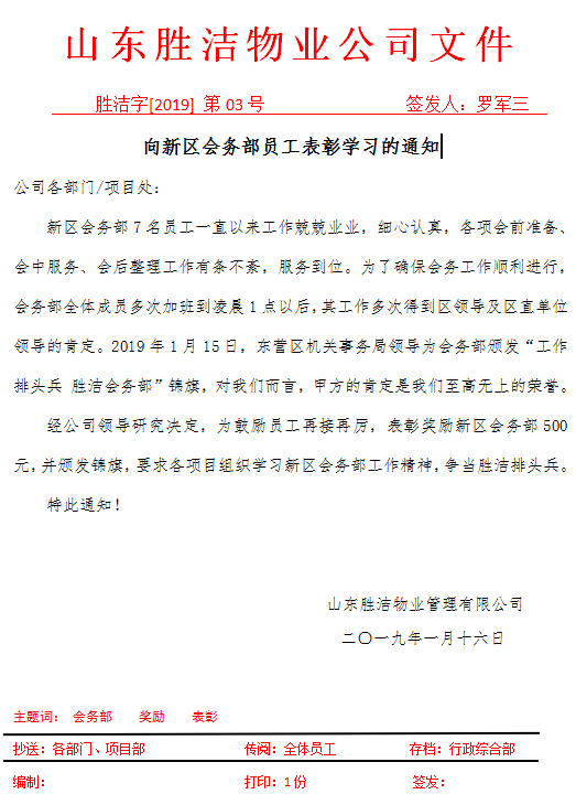 2019年1月15日,東營市東營區機關事務管理局召開會議,對山東勝潔物業管理有限公司東營區政府行政辦公中心會務部進行表彰。會上首先由杜局長講話指出:勝潔物業會務部工作表現突出,認真做好各項會前準備工作、會中服務工作,確保每次會議都能順利舉行,會務音箱設備的使用及會場的暖氣溫度控制等都是零失誤。