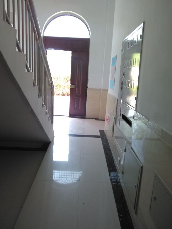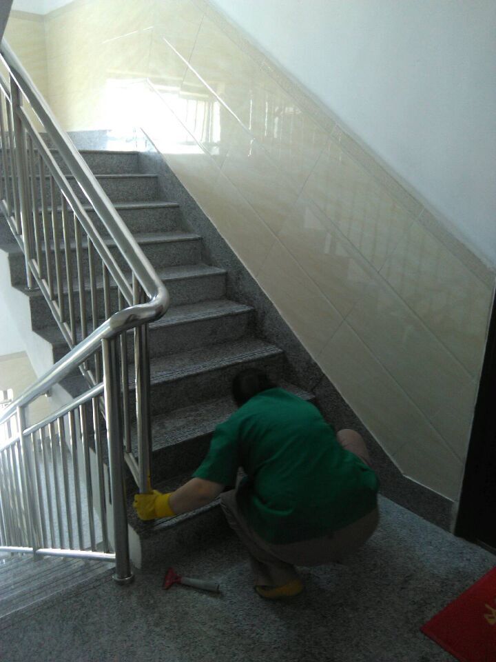 悅來山水居小區(qū)保潔阿姨手拿抹布擦拭樓道