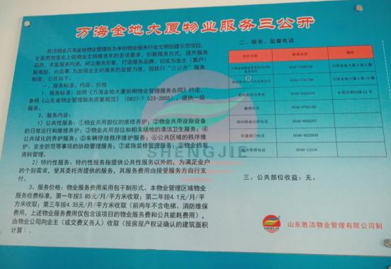 項目處全面落實“三公開”制度、公開萬海金地大廈物業(yè)服務價格、標準、內(nèi)容,公開投訴渠道和電話號碼。