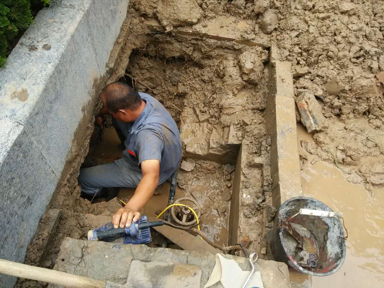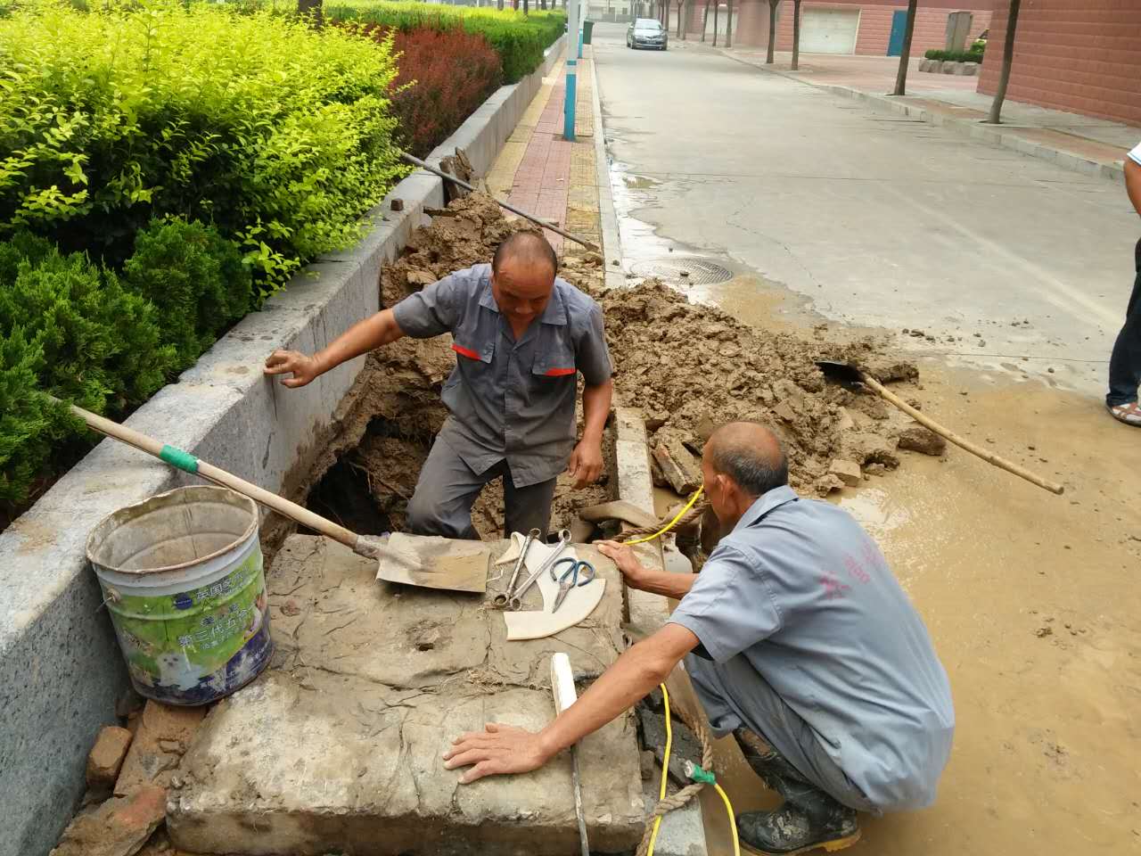 山東勝潔物業集團金盾管理項目處水管線破裂,及時聯系供水公司進行搶修。(以下為搶修現場圖),公司項目處工程人員積極配合施工。