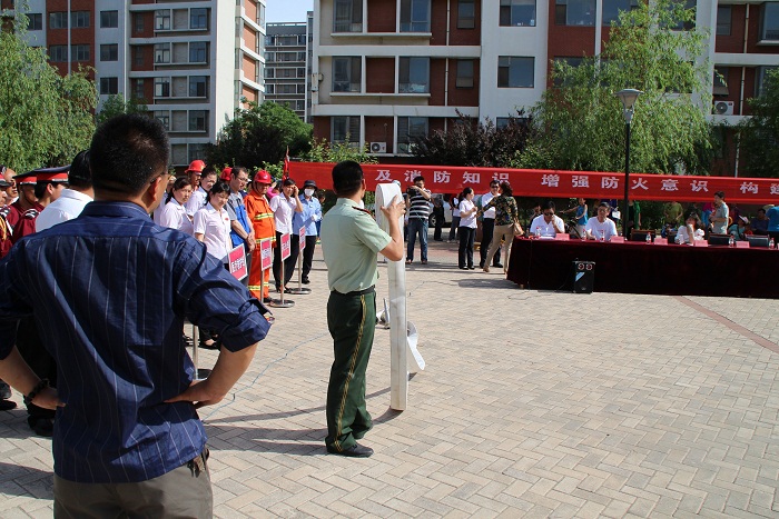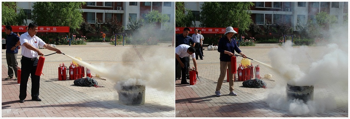 消防人員講解滅火器,并現場示范,項目員工以及小區業主認真觀看學習